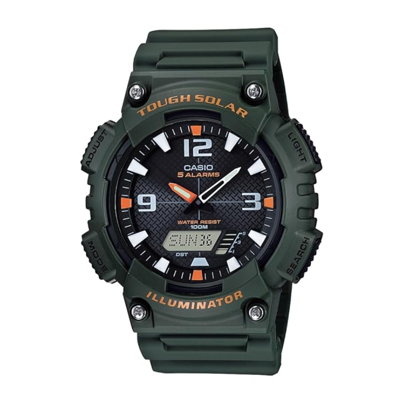 CASIO SOLAR POWERED• Tough solar• World time• 1/100-second stopwatch• 5 alarms• LED light (LCD part only)• 100-meter water resistance• Sporty design• 6-language day of the week indicator (English, Portuguese, Spanish, French, German, Italian)
