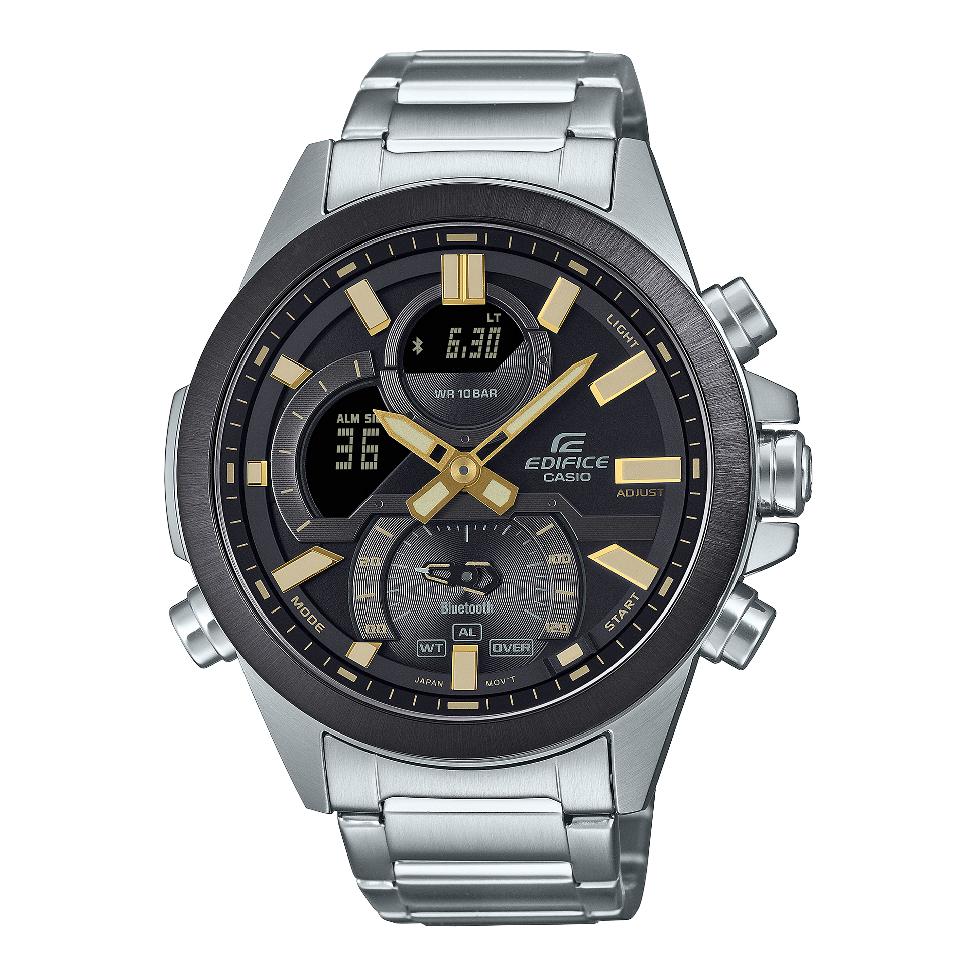 Welcome to the evolution of Speed & Intelligence — the high-spec, high-tech beauty of the EDIFICE metal chronograph with serious style and effortless smartphone connectivity. With this model, it’s a snap to sync with your smartphone via Bluetooth® and tap into the CASIO WATCHES app for full functionality at your fingertips. The app ensures button-free precision timekeeping when your phone is near. Developed to meet the needs of racing teams, the schedule timer syncs with your smartphone’s calendar app to transmit schedule items to the phone and display start and end times on the watch’s LCD. Equipped with LED light that illuminates with just a tilt of the wrist. Inspired by the sports car, the mechanical face design enhances depth and dimensionality to evoke the dynamic look, strength, and solidity of these high-performance vehicles.