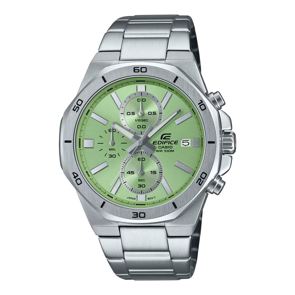 Experience the EDIFICE STANDARD CHRONOGRAPH MEN WATCH EFV-640D-3AVUDF, featuring a timeless design with a dynamic touch. This watch boasts a sporty chronograph and 10-bar water resistance, while the octagonal bezel showcases a refined hairline finish and polished sides for a sophisticated appearance. Add a pop of vibrant color to your wrist with this stylish and handsome timepiece.